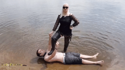 Lady Karame found out that this loser had been saying things about her behind her back. And they were all falsehoods. She did not want her reputation to suffer at the hand of someone who was lying about her. She chose to torture and humiliate him so that he never did it again. She trampled him as he lay by the riverbank and she made him lick her dirty and wet boots.